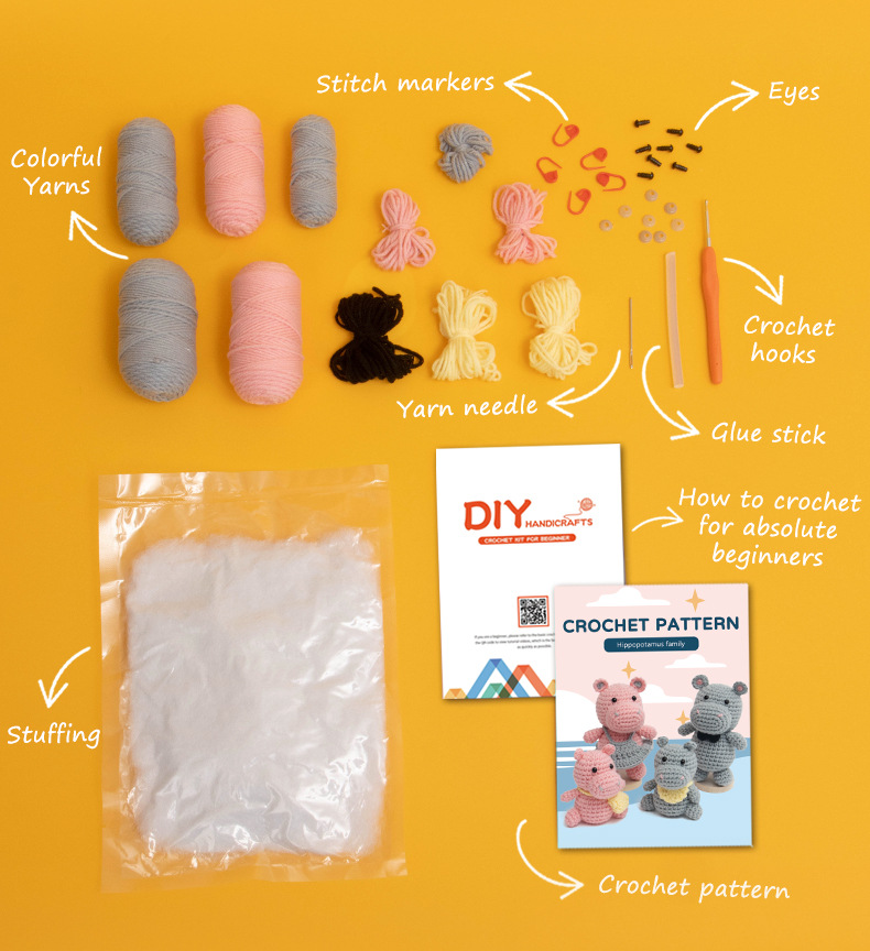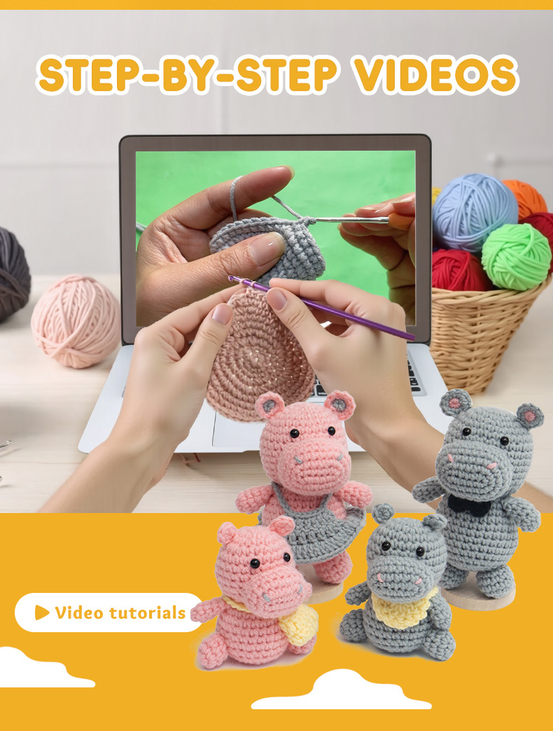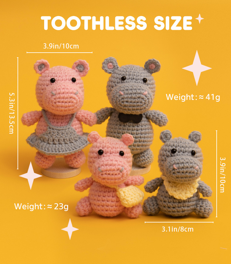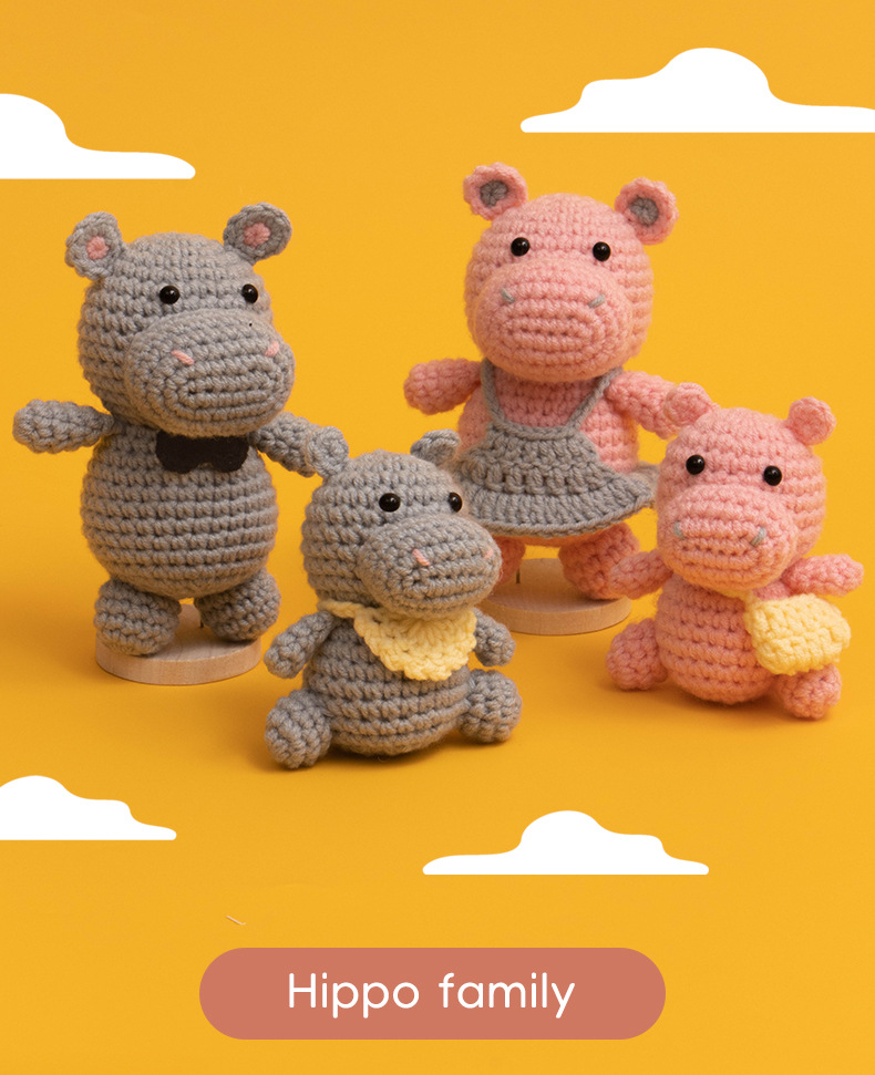 A family of hippos’ handmade DIY crochet project using knitting materials.