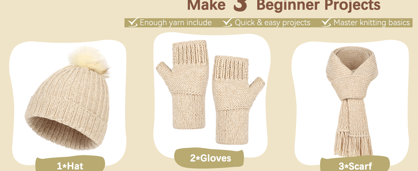 Learn three foundational knitting stitches while making real, wearable items: a cozy hat, a scarf, and a pair of mittens. The kit includes **extra yarn (about 10% more)** so beginners can practice freely without worrying about running out.