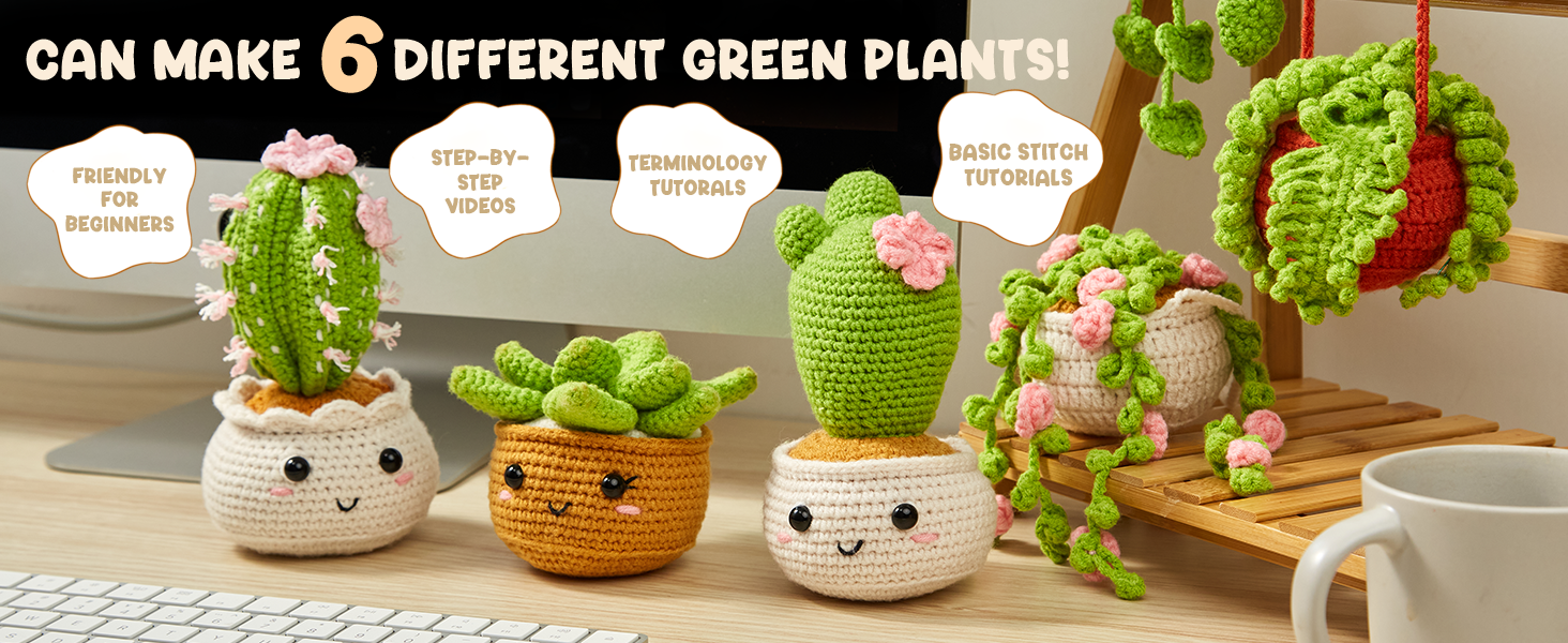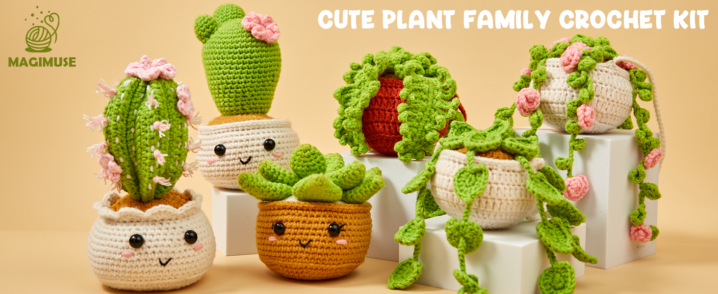 The MAGIMUSE crochet kit provides everything you need to create 6 adorable hanging plants. It includes a beginner-friendly illustrated guide, step-by-step video tutorials, 6 colors of premium yarn, fiberfill stuffing, safety eyes, an ergonomic crochet hook, a yarn needle, and stitch markers. Everything comes in one box—no extra shopping required!