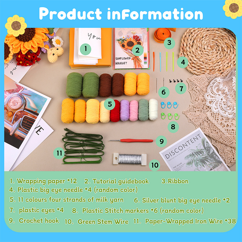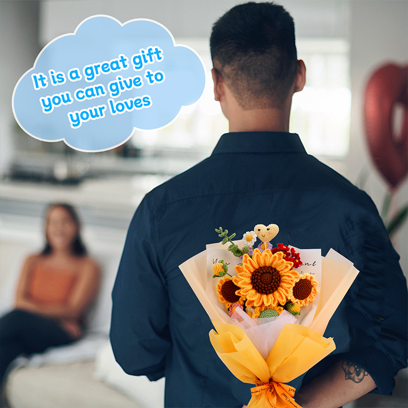 Crochet material pack – realistic handmade sunflower bouquet ornament as a birthday gift decoration