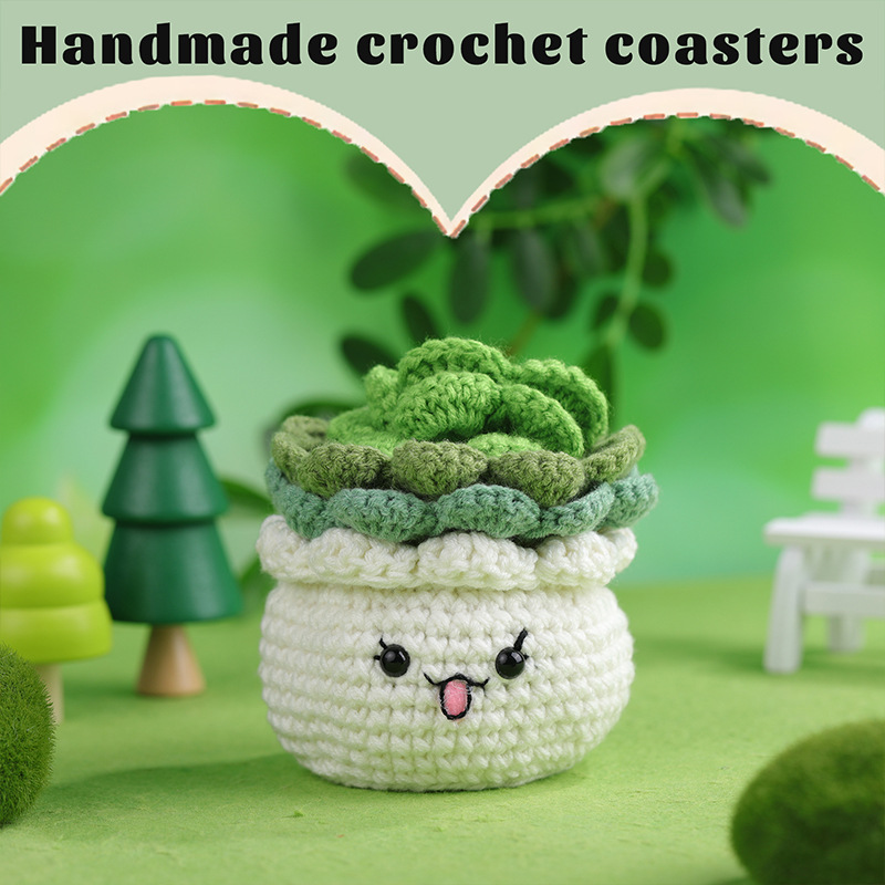 Crochet material pack – White basin with green plant cup cushion and potted plant style – Practical decorative item