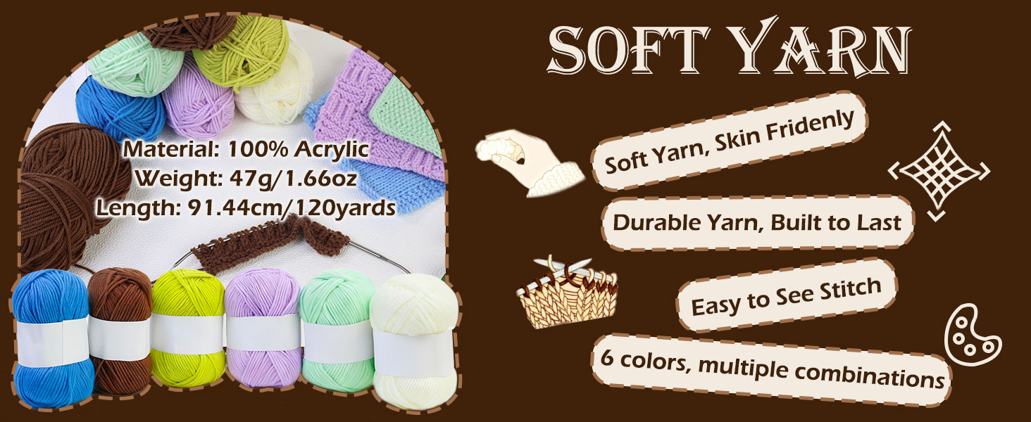 โ€ข 6 skeins of 100% acrylic yarn โ€“ soft, vibrant & machine washable